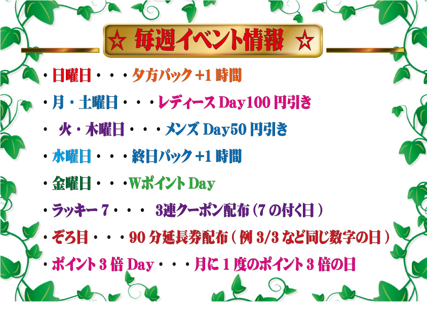 18時以降パックコースご利用のお客様対象でパック+1時間サービス致します。